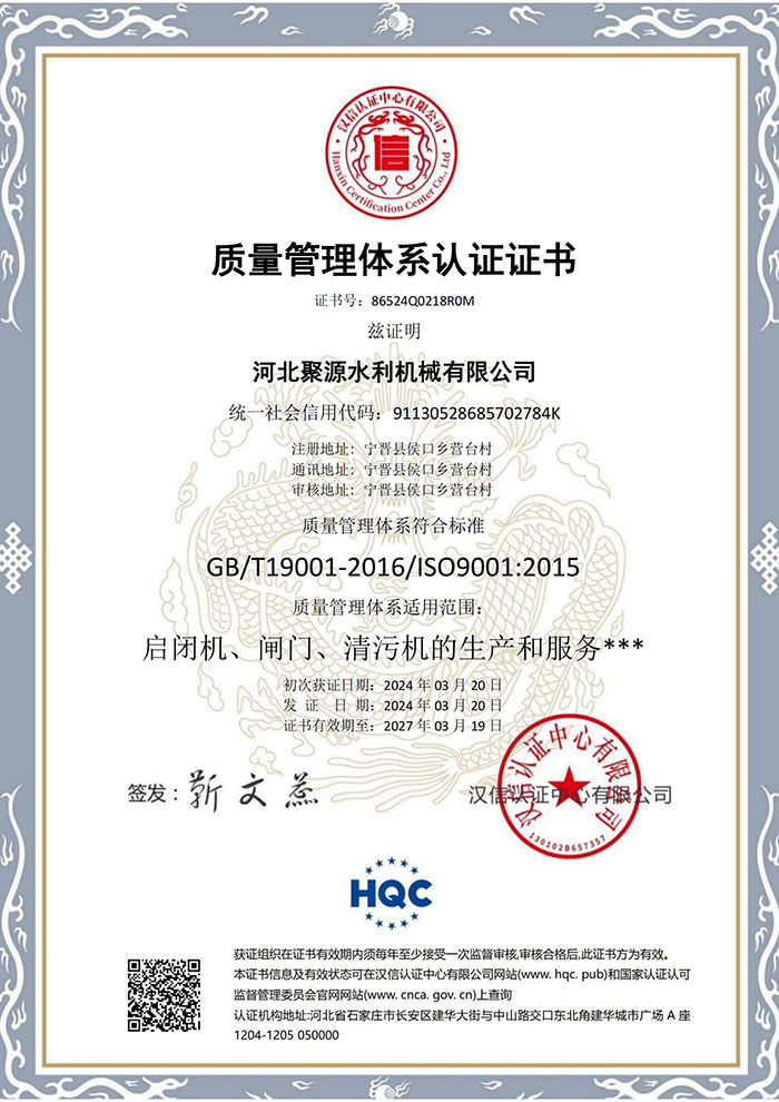 河北聚源水利機(jī)械有限公司是生產(chǎn)啟閉機(jī)、閘門的廠家,占地100余畝,職工近百人,其中高文憑工程師占比20%以上,持有各種專業(yè)證書且具有豐富經(jīng)驗(yàn)的各種技工占比60%以上。公司主營(yíng)智能測(cè)控一體化閘門、智能數(shù)字螺桿啟閉機(jī)、啟閉機(jī)、鑄鐵(鋼)閘門、攔污柵、格柵、清污機(jī)、輸送機(jī)、液壓成套設(shè)備、鋼壩、液壓壩、橡膠壩、合頁(yè)壩、氣盾壩、分段節(jié)流壩、翻板門、螺旋壓榨一體機(jī)、水閘、機(jī)械排水、壓力鋼管、閥門、水利設(shè)備控制系統(tǒng)設(shè)計(jì)及零配件研發(fā)、生產(chǎn)、銷售、安裝、維修,產(chǎn)品多樣,型號(hào)齊全,質(zhì)量可靠,智能化信息化功能完善,可以根據(jù)客戶的需求定制產(chǎn)品。